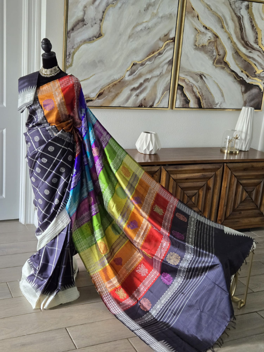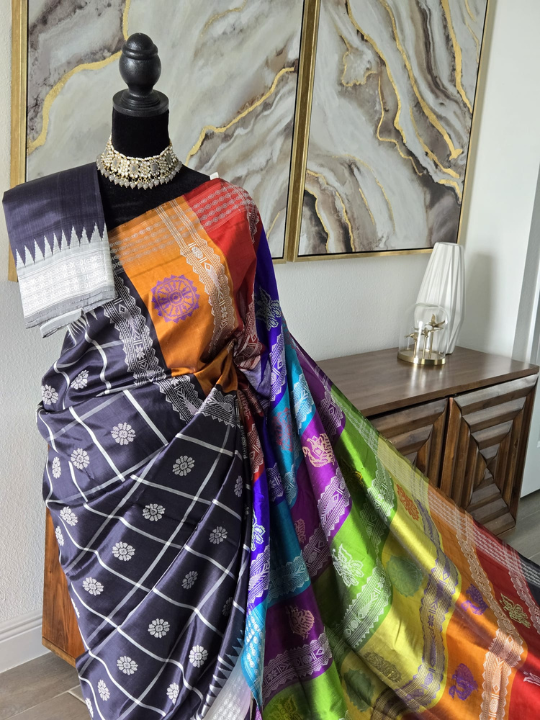 Black Behrampuri Silk Saree with Multicolor Pallu & Temple Borders