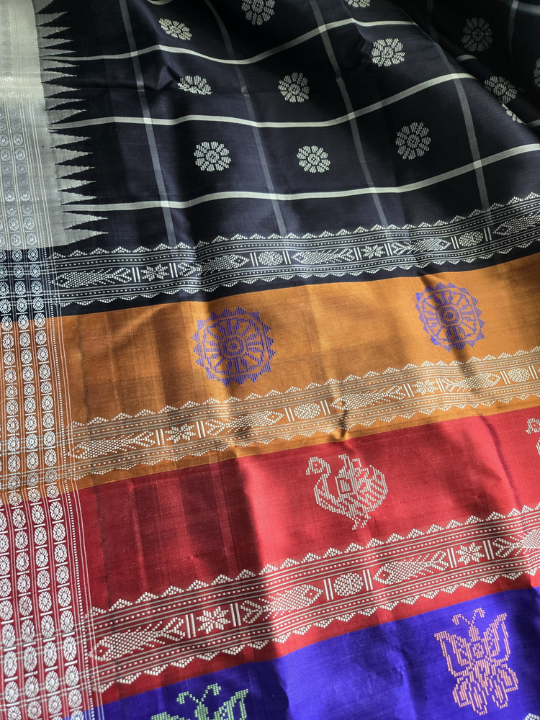 Within these broad color bands, there are distinct, richly woven motifs in contrasting colors. These motifs appear to be a mix of traditional Odissi designs, possibly including:
