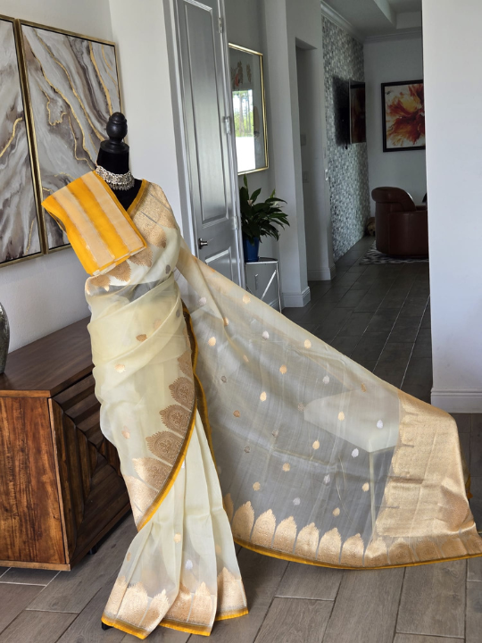 Cream Organza Saree with Gold Zari Work & Yellow Piping Accent