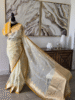 Overall, this organza saree is a blend of traditional elegance and contemporary style, perfect for festive occasions or formal events. The combination of the subtle cream base, opulent gold weaving, and the unexpected vibrant yellow accent makes it quite distinctive.
