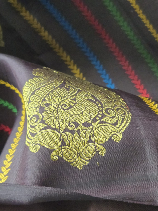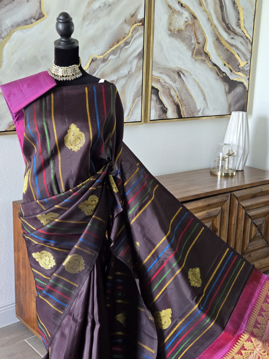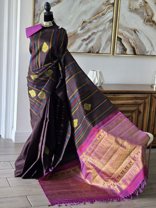 - Body: The dark brown body of the saree features scattered zari buttis (small motifs). These ornate, traditional motifs have paisleys and floral patterns, woven in gold zari. There are also subtle, multi-colored striped accents (yellow, blue, red) woven into the brown body, adding a unique touch and suggesting a contemporary or fusion element within the traditional weave.