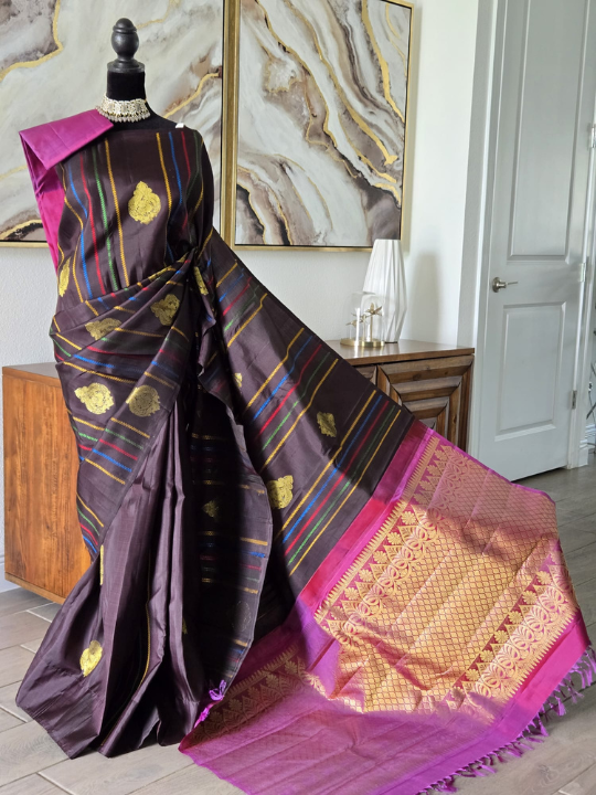 A striking Kanjeevaram silk saree featuring a deep maroon-brown body adorned with gold zari buttis and subtle multi-color woven stripes. Contrasted beautifully with a vibrant rani pink border and pallu, richly embellished in traditional gold zari motifs, this saree blends heritage elegance with a hint of contemporary flair.