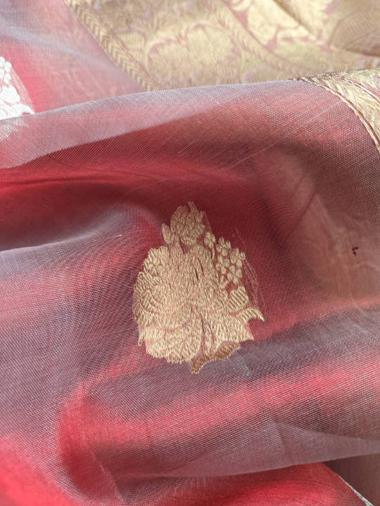 Color and Transparency: The dominant color of the saree is a beautiful dusty rose or muted peach/pink, with a remarkable sheer, translucent quality characteristic of tissue fabric. This sheerness gives it a lightweight and ethereal appearance. The color also seems to shift subtly depending on the light or drape, adding to its allure.
