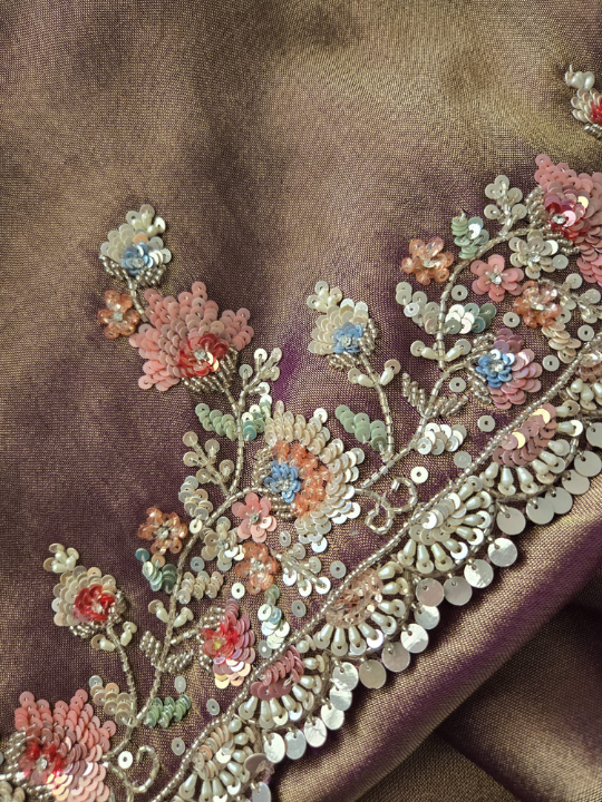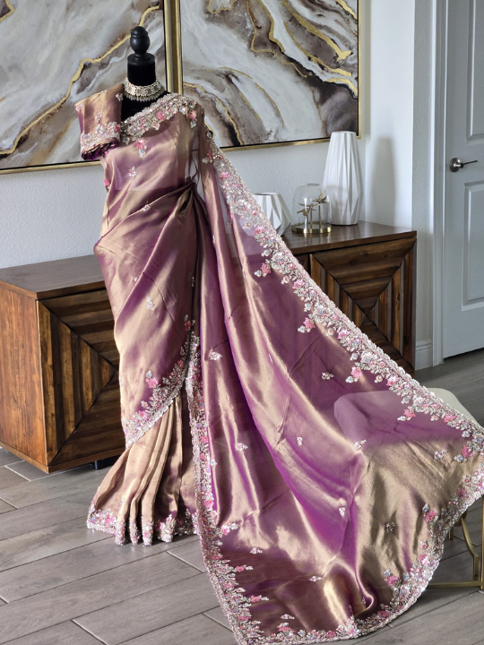 A dual-tone gold and purple tissue silk saree, richly adorned with pastel floral embroidery, sequins, pearls, and beadwork. Features intricate border and pallu detailing for a regal finish.
