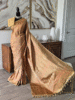 This Tanchoi Benarasi saree features a dominant golden-tan or beige base color, which gives it a rich and sophisticated appeal. The saree is adorned with intricate paisley motifs and delicate floral patterns woven throughout the fabric.