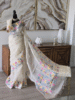 A vibrant Jamdani saree featuring a sheer cream base with handwoven floral vines in pink, yellow, and teal. Accented by pastel-striped borders and a richly detailed pallu.