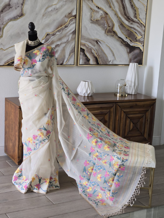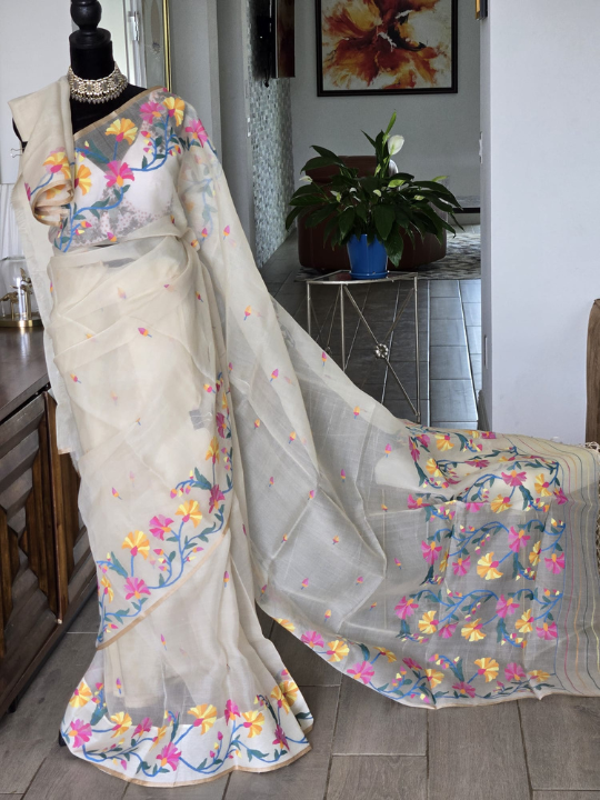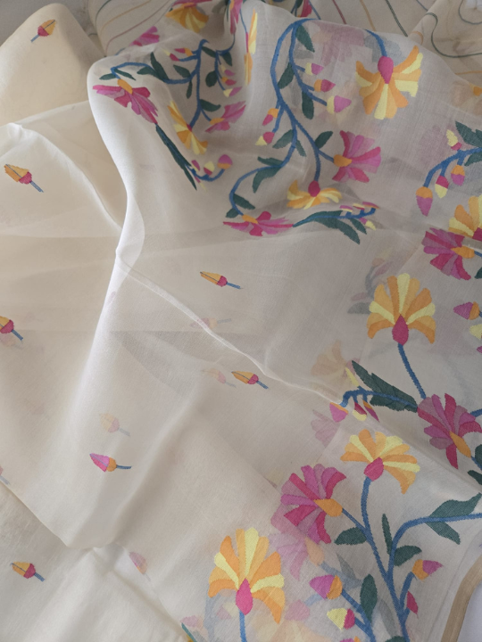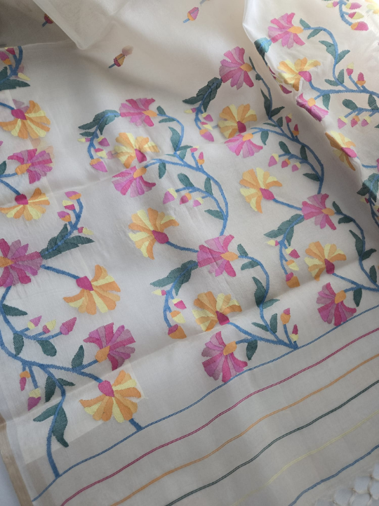 - Woven Motifs: The body and the pallu (the decorative end) of the saree are adorned with stylized floral patterns. These are skillfully woven directly into the fabric using the discontinuous weft technique unique to Jamdani. 1 The flowers are depicted in a lively palette of colors, including bright pink, sunny yellow, and teal or blue for the leaves and stems.
