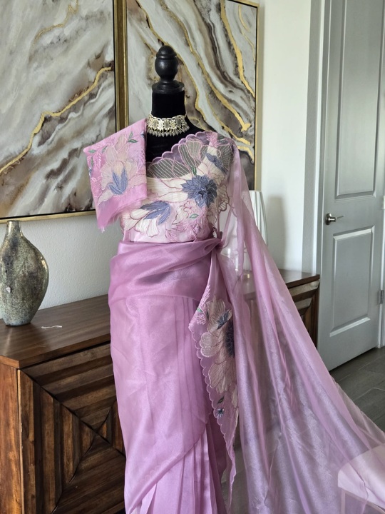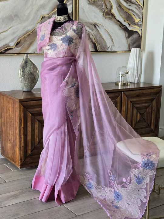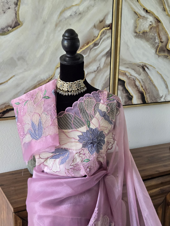 Delicate lavender glass tissue saree featuring hand pitta work with large floral motifs in blue, purple, and green. Finished with scalloped edges and a richly detailed, ethereal pallu.