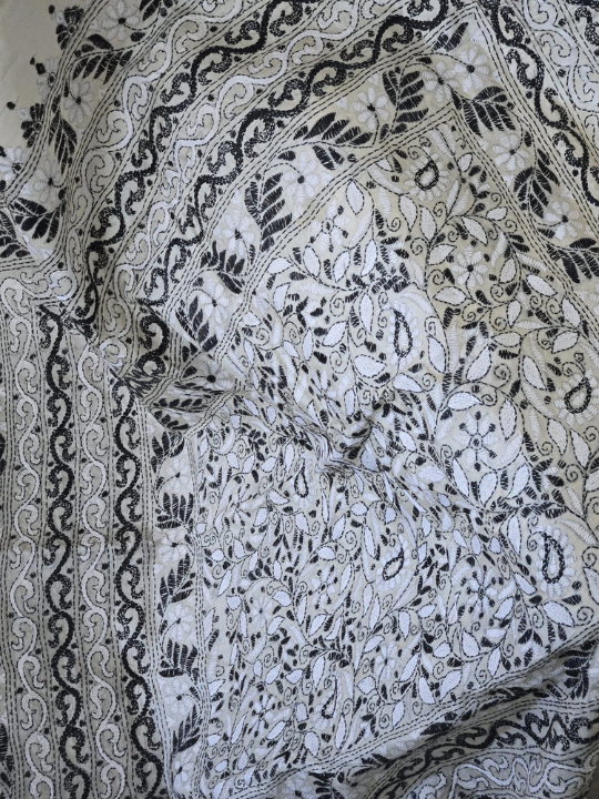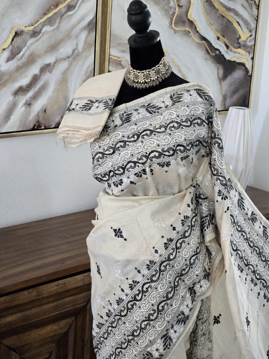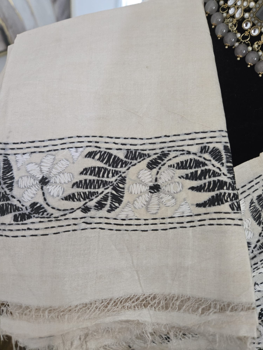 • Embroidery: The entire saree is adorned with running stitches, creating a tapestry of designs. The motifs include floral patterns, leaves,  all rendered in a contrasting color, likely black, which makes the designs stand out sharply against the lighter base.