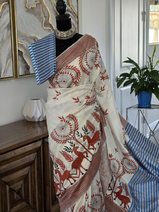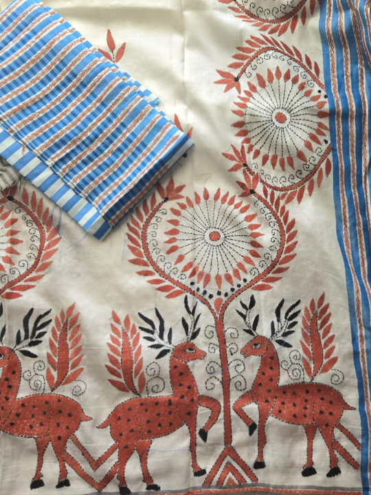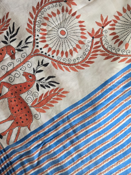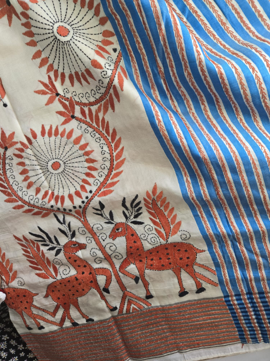Off-White Kantha Stitch Saree with Deer & Tree Motifs