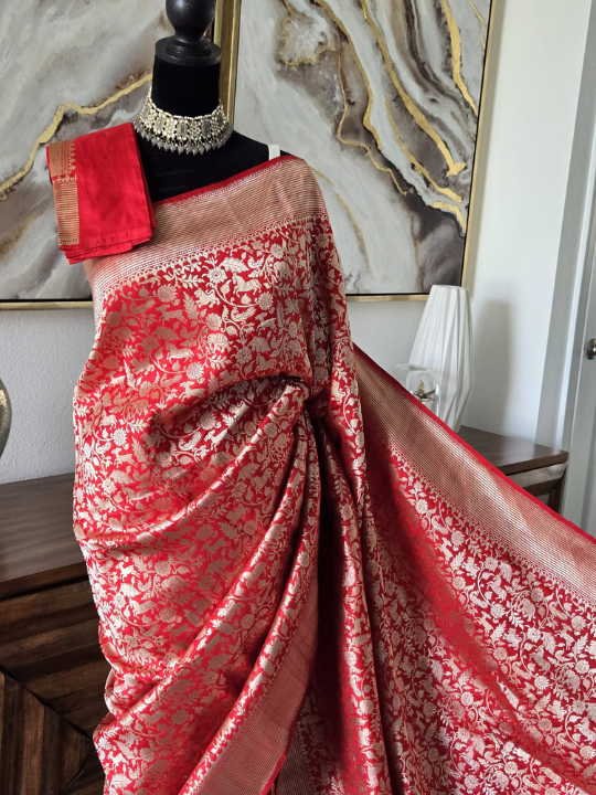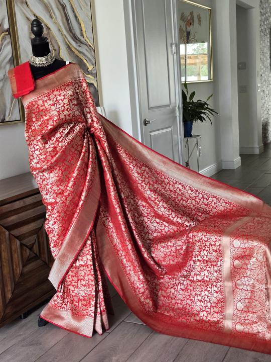 Striking red Katan Banarasi silk saree featuring intricate all-over floral brocade in gold or silver zari, with rich borders and a grand pallu. A luxurious choice for weddings and festive occasions.