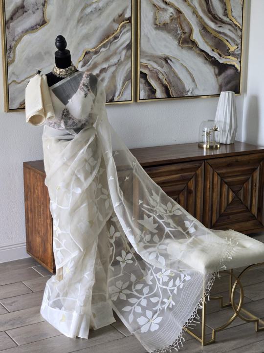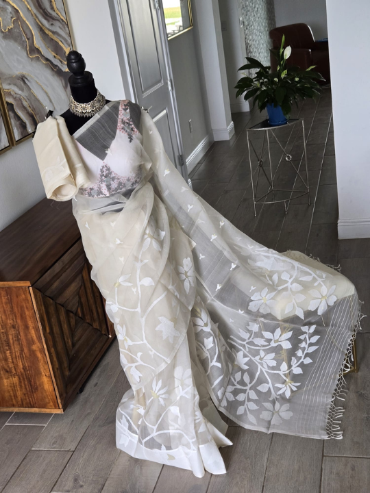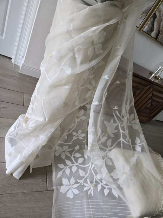 - Fabric: The fabric appears incredibly lightweight and sheer, characteristic of very fine muslin or organza Jamdani. This transparency gives the saree a delicate and flowing drape.